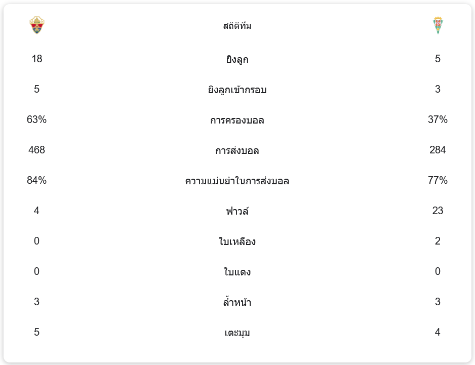 สถิติการแข่งขัน แสดงให้เห็นว่าเอลเช่มีความเหนือกว่าในทุกด้าน พวกเขาครองบอลได้ถึง 63% และมีความแม่นยำในการส่งบอลสูงถึง 84% เมื่อเทียบกับคอร์โดบ้าที่ครองบอลเพียง 37% และส่งบอลด้วยความแม่นยำที่ 77% นอกจากนี้ เอลเช่ยังสร้างโอกาสยิงได้ถึง 18 ครั้ง และเข้ากรอบ 5 ครั้ง ขณะที่คอร์โดบ้ามีโอกาสยิงเพียง 5 ครั้ง และเข้ากรอบ 3 ครั้ง