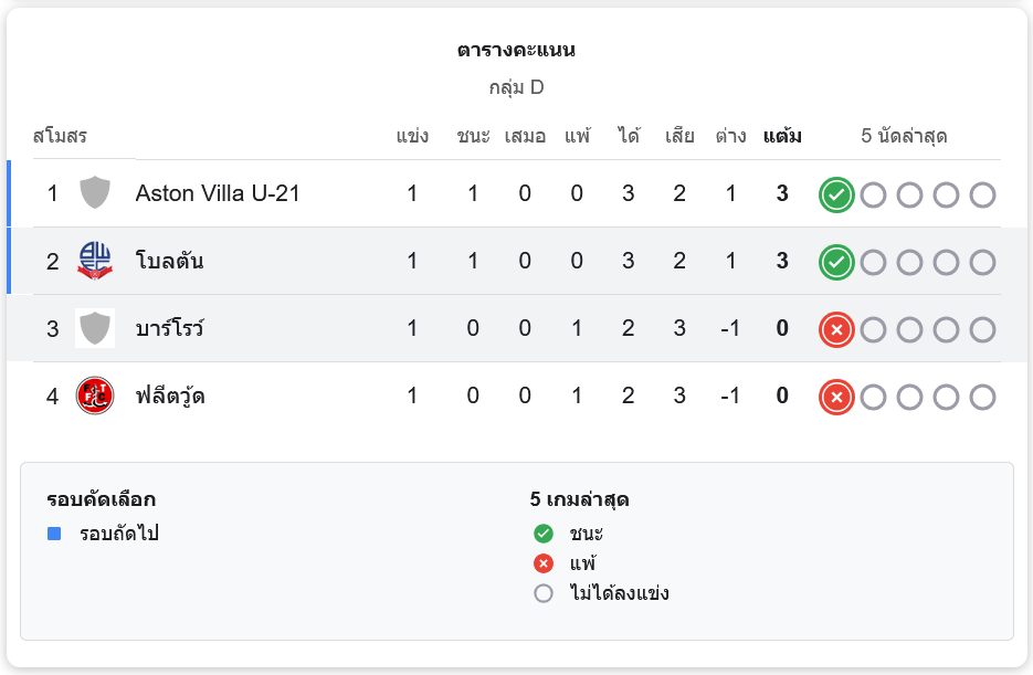 หลังจากเกมนี้ โบลตัน วอนเดอเรอส์ ได้คะแนนเพิ่ม 3 แต้ม ทำให้พวกเขาขยับขึ้นมาเป็นอันดับที่ 2 ในกลุ่ม D มีคะแนนรวม 3 แต้ม ซึ่งตามหลัง Aston Villa U-21 เพียงผลต่างประตูได้เสียเท่านั้น ส่วนบาร์โรว์ยังคงอยู่ในอันดับที่ 3 ของกลุ่ม ด้วยการแพ้ในเกมแรกและยังไม่มีคะแนน