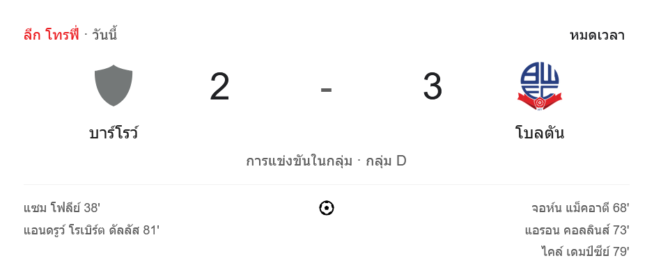 ผลบอลจอห์นสโตนส์ เพนท์โทรฟี่ 2024 บาร์โรว์ 2-3 โบลตัน วอนเดอเรอส์