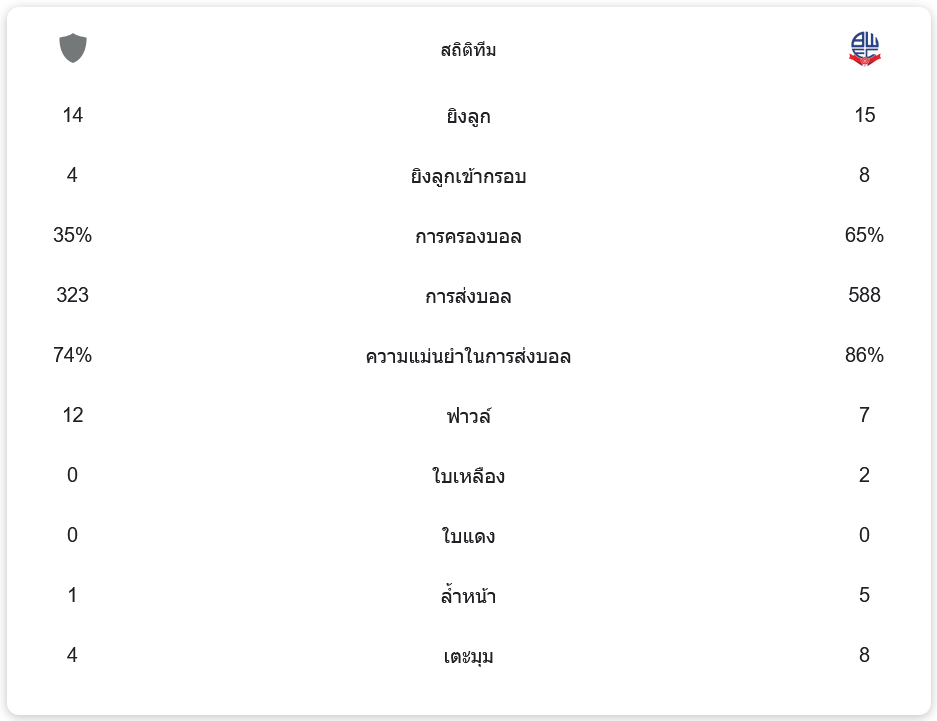 ในเกมนี้ โบลตันมีการครองบอลที่โดดเด่นกว่า โดยครองบอลถึง 65% เทียบกับบาร์โรว์ที่ครองบอลเพียง 35% การส่งบอลของโบลตันมีความแม่นยำสูงถึง 86% จากการส่งบอลทั้งหมด 588 ครั้ง ซึ่งช่วยให้พวกเขาคุมเกมได้ดีและสร้างโอกาสในการบุกได้มากขึ้น ส่วนบาร์โรว์มีการส่งบอลทั้งหมด 323 ครั้งด้วยความแม่นยำ 74% แม้ว่าจะมีโอกาสยิงทั้งหมด 14 ครั้ง แต่สามารถยิงเข้ากรอบได้เพียง 4 ครั้ง ในขณะที่โบลตันยิงทั้งหมด 15 ครั้งและยิงเข้ากรอบได้ถึง 8 ครั้ง การเล่นที่ดุดันและการใช้โอกาสอย่างมีประสิทธิภาพทำให้โบลตันสามารถคว้าชัยชนะได้สำเร็จ