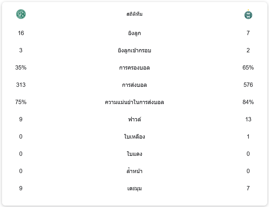สถิติการแข่งขัน ชี้ชัดว่ากอริติบ้ามีโอกาสยิงทั้งหมด 7 ครั้ง และเข้ากรอบเพียง 2 ครั้ง ขณะที่กัวรานี่มีโอกาสยิงทั้งหมด 16 ครั้ง เข้ากรอบ 3 ครั้ง แม้จะครองบอลน้อยกว่า (เพียง 35% เท่านั้น) แต่ก็มีความแม่นยำในการส่งบอลถึง 75% ทำให้การบุกมีประสิทธิภาพ