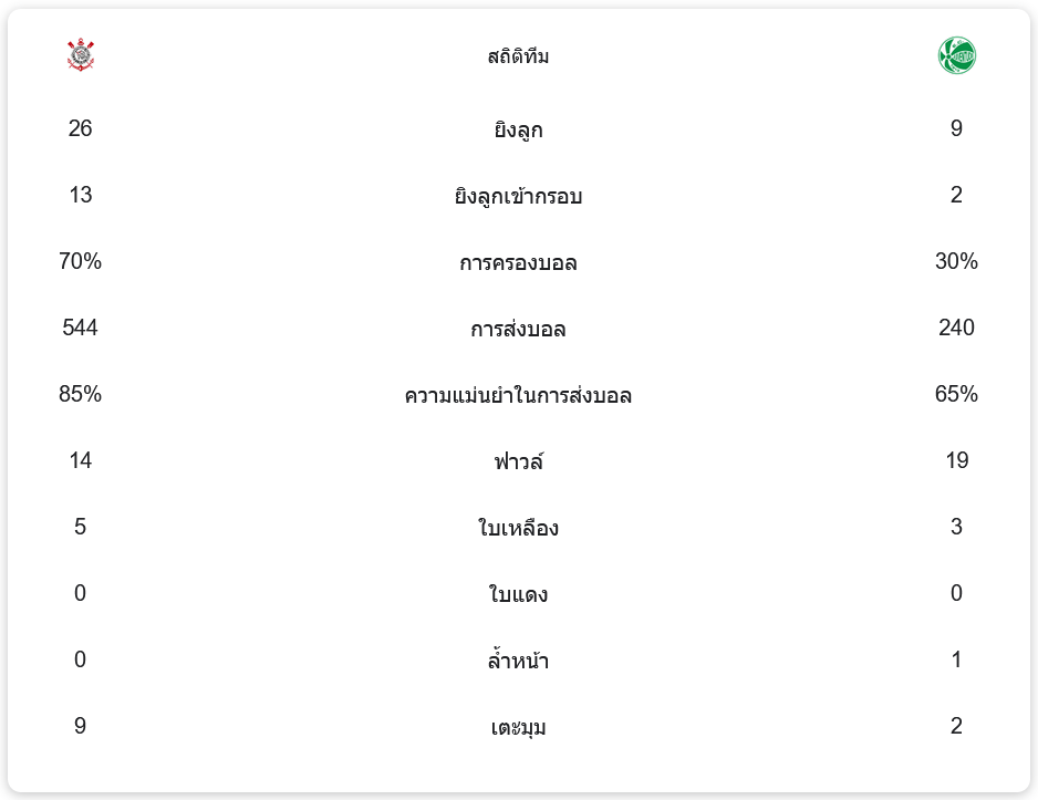 - นาทีที่ 82: เซ มาร์กอส ทำเข้าประตูตัวเอง ทำให้คอรินเทียนส์นำ 2-1