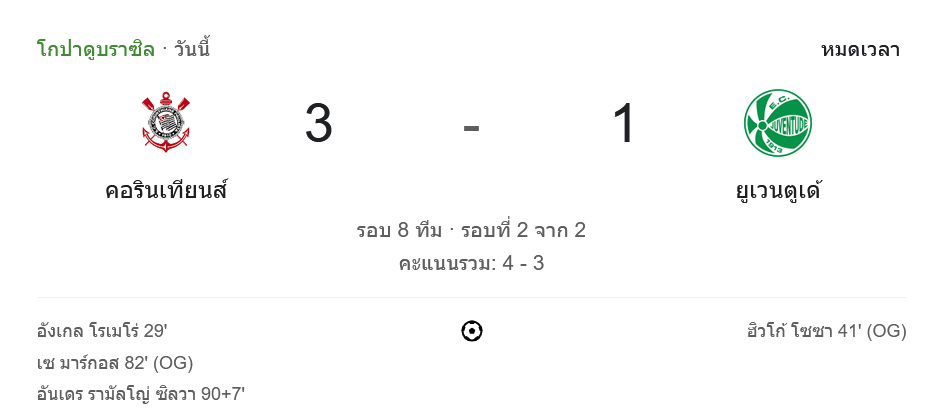 การแข่งขันฟุตบอล บราซิล คัพ 2024 ระหว่าง สปอร์ตคลับ คอรินเทียนส์ เปาลิสตา และ ยูเวนตูเด้ จบลงด้วยผลสกอร์ 3-1 โดยคอรินเทียนส์สามารถทำประตูได้ถึง 3 ลูกในเกมนี้ แม้ว่าจะมีการยิงเข้าประตูตัวเองจากผู้เล่นของทีมก็ตาม ทำให้พวกเขาผ่านเข้ารอบถัดไปของทัวร์นาเมนต์ด้วยคะแนนรวม 4-3 เมื่อรวมผลการแข่งขันทั้งสองนัด