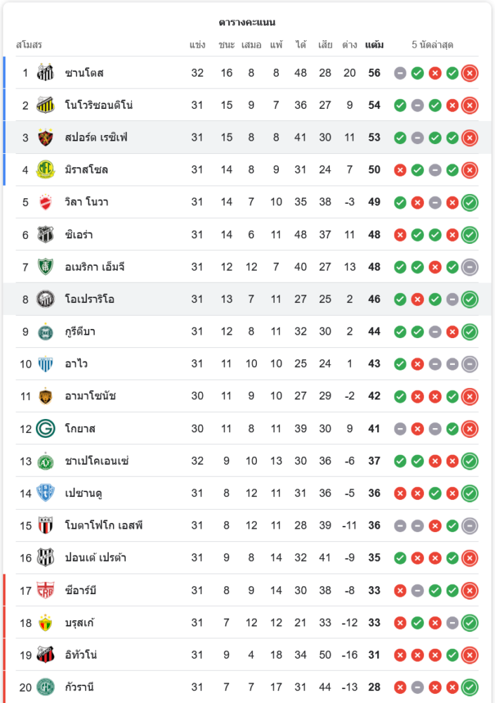 ตารางคะแนนคัมปิโอนาโต บราซิเลียโร ซีรีบี 2024 ระหว่าง สปอร์ต คลับ เรซิเฟ่ พีอี 1-2 โอเปราริโอ แฟร์โรวิอาริโอ พีอาร์