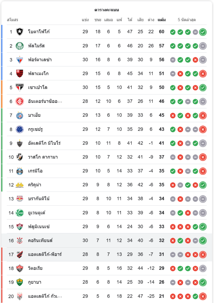 ตารางคะแนนกังเปโอนาตู บราซีเลย์รู แซรียีอา 2024 ระหว่าง สปอร์ตคลับ คอรินเทียนส์ เปาลิสตา 5-2 แอตเลติโก้ พาราเนนเซ่