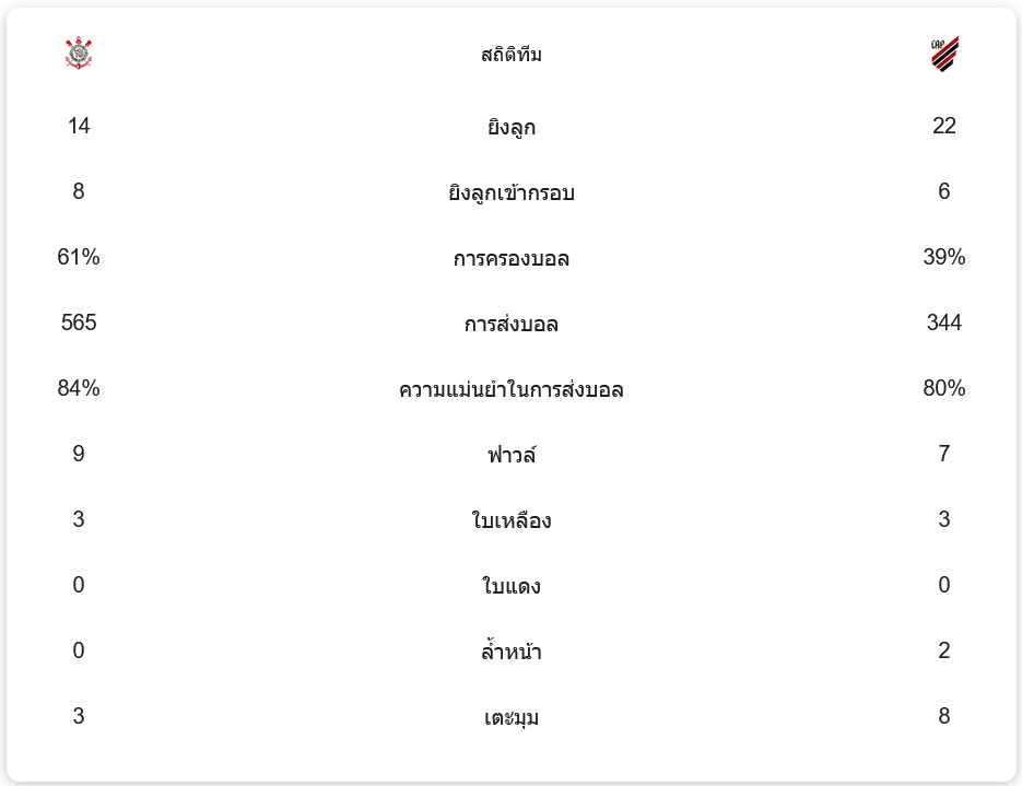 คอรินเทียนส์ครองบอลได้มากถึง 61% และทำการส่งบอล 565 ครั้ง ด้วยความแม่นยำ 84% ขณะที่แอตเลติโก้ พาราเนนเซ่ครองบอลได้เพียง 39% และส่งบอลสำเร็จ 344 ครั้ง แม้ว่าพวกเขาจะมีโอกาสยิงถึง 22 ครั้ง มากกว่าคอรินเทียนส์ที่ยิง 14 ครั้ง แต่ความเฉียบขาดของคอรินเทียนส์ในจังหวะการยิงเข้ากรอบ 8 ครั้ง นั้นทำให้พวกเขาสามารถยิงได้ถึง 5 ประตู ในเกมนี้