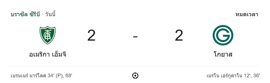 การแข่งขันฟุตบอล คัมปิโอนาโต บราซิเลียโร ซีรีบี 2024 นัดนี้เป็นการดวลกันระหว่าง อเมริกา เอ็มจี และ โกยาส ที่จบลงด้วยผลเสมอสุดมันส์ 2-2 โดยในเกมนี้ เบรโน เอรกูลาโน จากโกยาสทำสองประตูในครึ่งแรก แต่ เบรนเนร์ มาร์กอส ของอเมริกา เอ็มจี ก็สามารถทำสองประตูเช่นกันในครึ่งแรกและครึ่งหลัง ทำให้ทั้งสองทีมแบ่งแต้มกันไป