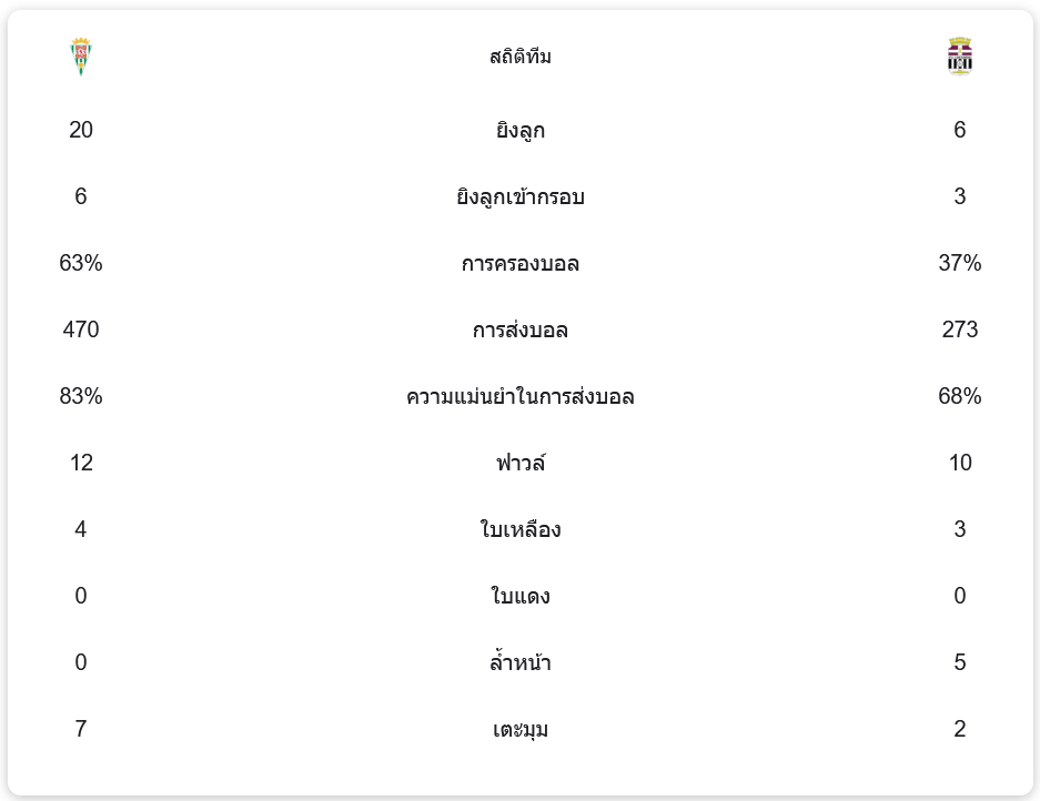 คอร์โดบ้า ครองเกมได้มากกว่าอย่างชัดเจน ด้วยการครองบอลถึง 63% และการยิงทั้งหมด 20 ครั้ง ซึ่งเข้ากรอบ 6 ครั้ง ขณะที่คาร์ทาเกน่า ครองบอลได้เพียง 37% และมีโอกาสยิงเพียง 6 ครั้ง โดยเข้ากรอบ 3 ครั้ง การส่งบอลของคอร์โดบ้ามีความแม่นยำสูงถึง 83% เทียบกับคาร์ทาเกน่าที่ทำได้ 68% แสดงให้เห็นถึงความเหนือชั้นในการคุมเกมของคอร์โดบ้า