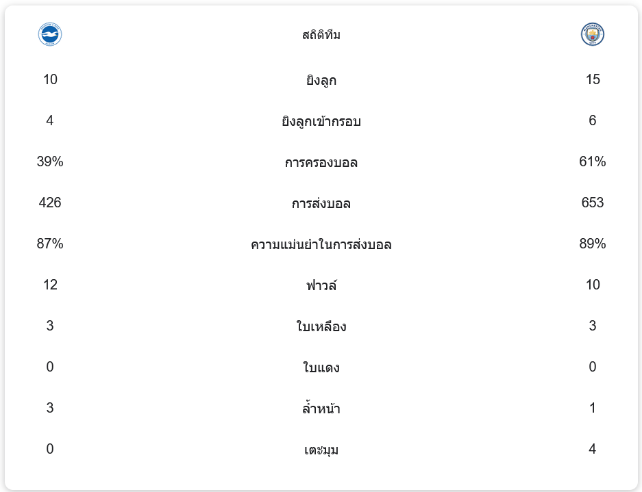 แม้แมนเชสเตอร์ ซิตี้จะครองบอลได้ถึง 61% และยิงรวม 15 ครั้ง แต่ไบรท์ตันที่มีโอกาสยิงน้อยกว่า (10 ครั้ง) กลับสามารถพลิกเกมได้ในครึ่งหลัง ด้วยการยิงเข้ากรอบที่เด็ดขาดและคมกริบ ทำให้สกอร์สุดท้ายจบลงด้วยชัยชนะของไบรท์ตัน