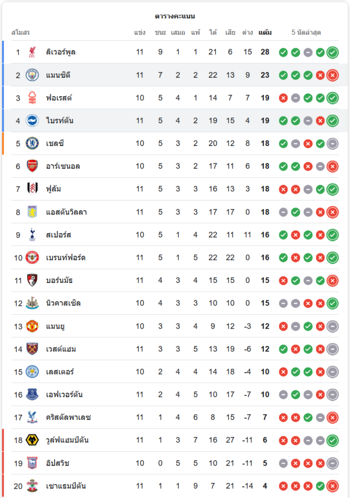 จากผลบอลสดนัดนี้ ไบรท์ตันขึ้นมาอยู่ในอันดับ 4 ด้วยคะแนน 19 แต้ม ส่วนแมนเชสเตอร์ ซิตี้ยังคงอยู่ในอันดับ 2 แต่แต้มตามหลังลิเวอร์พูลที่ยังนำเป็นจ่าฝูงอยู่
