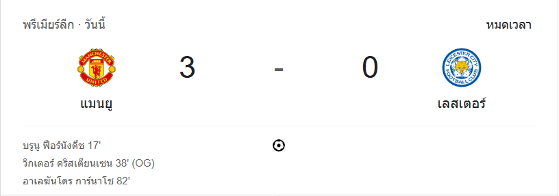 - นาทีที่ 38 ประตูตัวเอง! วิคเตอร์ คริสเตียนเซ่น (เลสเตอร์ ซิตี้) ทำเข้าประตูตัวเอง หลังจากการยิงของบรูโน่ที่พลาดเป้า แมนฯ ยูไนเต็ดนำห่าง 2-0