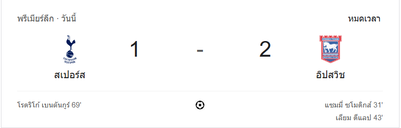 - นาทีที่ 90+7: จบเกม ท็อตแน่ม ฮ็อทสเปอร์พ่ายให้กับอิปสวิช ทาวน์ไปด้วยสกอร์ 1-2