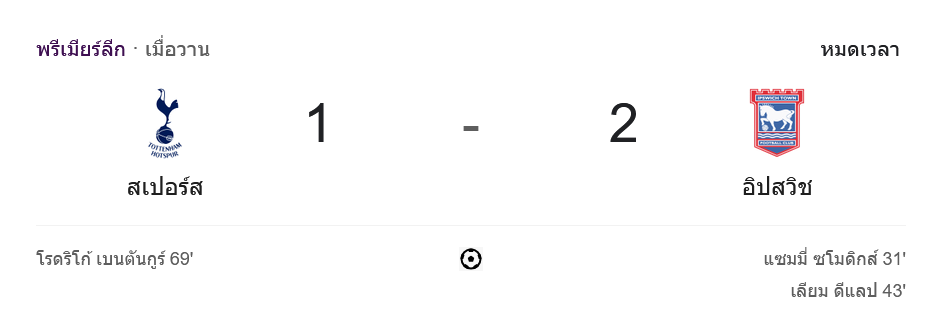 บ้านผลบอล รายงานผลการแข่งขันฟุตบอลพรีเมียร์ลีก 2024 เมื่อท็อตแน่ม ฮ็อทสเปอร์เปิดสนามรับการมาเยือนของอิปสวิช ทาวน์ ซึ่งเป็นทีมที่หลายคนคาดว่าจะเสียเปรียบ แต่กลับเป็นฝ่ายทำช็อกด้วยการคว้าชัยชนะ 2-1 ได้สำเร็จ ผลบอลสด คู่นี้เต็มไปด้วยความเข้มข้นตลอดทั้งเกม โดยมีการปะทะที่ดุดันและการเล่นที่เหนือชั้นจากผู้เล่นของอิปสวิช ทาวน์