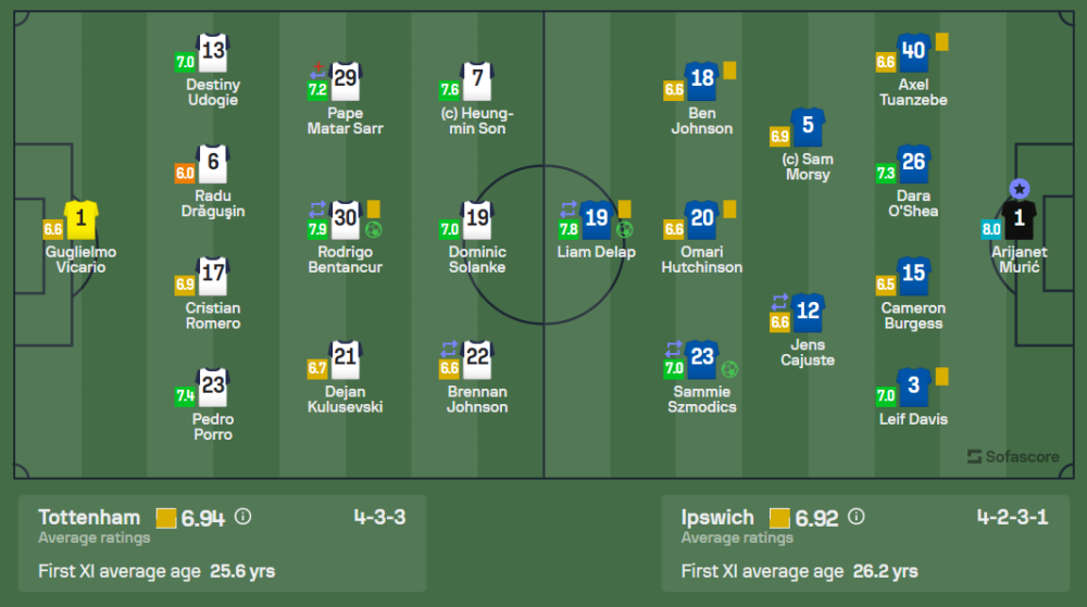 ท็อตแน่ม ฮ็อทสเปอร์ใช้แผน 4-3-3 เน้นการครองบอลและเปิดเกมรุกจากริมเส้นผ่านการขึ้นเกมของเปโดร ปอร์โร ขณะที่อิปสวิช ทาวน์มาในแผน 4-2-3-1 โดยใช้การโต้กลับเร็วและการเล่นบอลยาวจากแดนกลาง ส่งผลให้สามารถโจมตีและสร้างความอันตรายได้หลายครั้ง