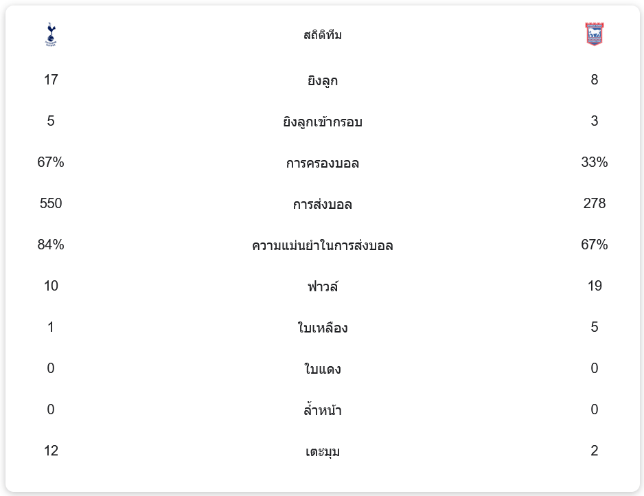 แม้ว่าสเปอร์สจะครองบอลได้มากถึง 67% แต่ยิงเข้ากรอบได้เพียง 5 ครั้งจากทั้งหมด 17 ครั้ง ขณะที่อิปสวิชมีการครองบอลเพียง 33% แต่ใช้โอกาสยิงเข้ากรอบได้ 3 ครั้งจาก 8 ครั้ง การปะทะและการทำฟาวล์ของทั้งสองทีมมีความดุดัน โดยสเปอร์สทำฟาวล์ 10 ครั้ง ส่วนอิปสวิชทำฟาวล์ถึง 19 ครั้ง