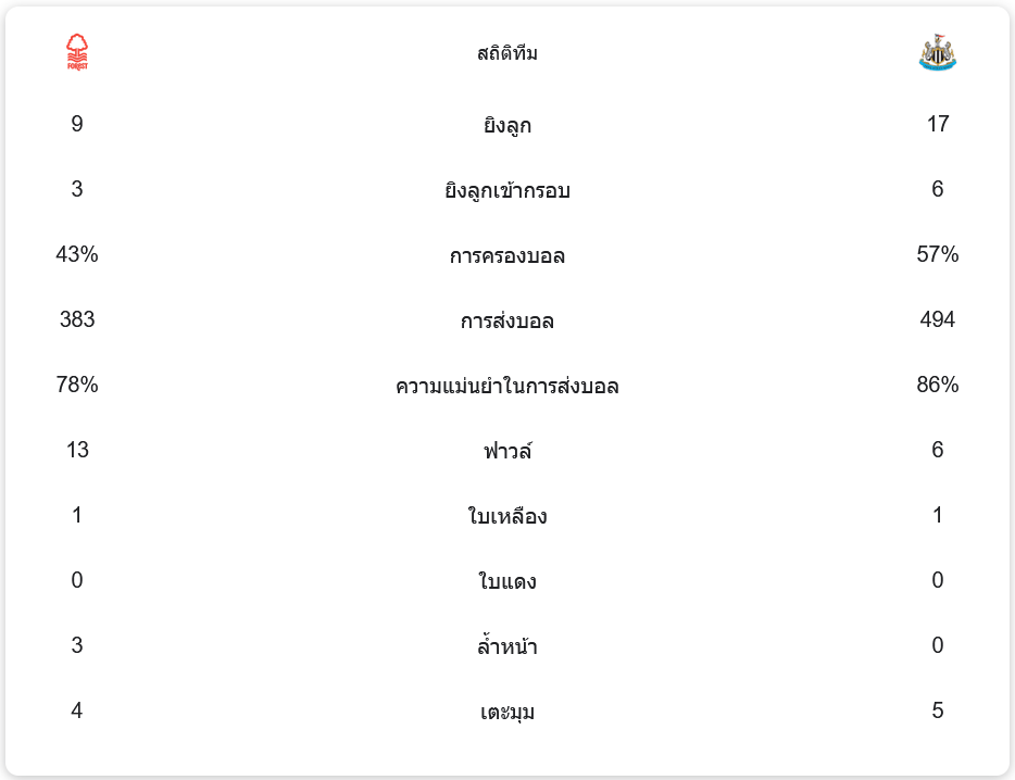 แม้ว่าฟอเรสต์จะมีการครองบอลเพียง 43% แต่สามารถยิงได้ถึง 9 ครั้ง โดยเข้ากรอบ 3 ครั้ง ในขณะที่นิวคาสเซิ่ลครองบอลได้ถึง 57% และสร้างโอกาสยิงได้ถึง 17 ครั้ง ซึ่งเข้ากรอบ 6 ครั้ง การครองบอลและการส่งบอลของนิวคาสเซิ่ลมีความแม่นยำสูงถึง 86% ทำให้สามารถควบคุมเกมได้ดี