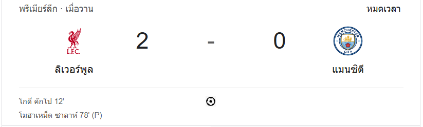 บ้านกีฬา รายงานผลบอลสดค่ำคืนนี้ “หงส์แดง” ลิเวอร์พูล เปิดรังแอนฟิลด์ดับความหวัง “เรือใบสีฟ้า” แมนเชสเตอร์ ซิตี้ ด้วยสกอร์ 2-0 โคดี้ กัคโป และ โมฮาเหม็ด ซาลาห์ คือผู้ทำประตูสำคัญที่พาทีมเจ้าบ้านเก็บสามแต้มไปครอง ท่ามกลางบรรยากาศที่เต็มไปด้วยความดุเดือดในสนาม