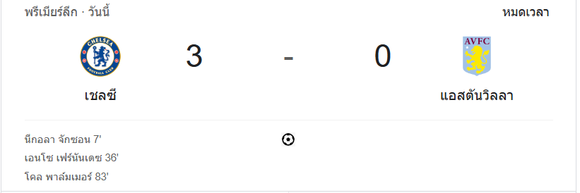 บ้านกีฬา พาคุณติดตามผลบอลสดในค่ำคืนนี้ เมื่อ “สิงห์บลู” เชลซี เปิดบ้านต้อนรับการมาเยือนของ “สิงห์ผงาด” แอสตัน วิลล่า ด้วยฟอร์มที่เหนือชั้น เชลซีสามารถเก็บชัยชนะไปด้วยสกอร์ 3-0 ชัยชนะนี้ทำให้ทีมเจ้าบ้านคว้าสามแต้มสำคัญและส่งสัญญาณถึงทีมคู่แข่งว่า “สิงห์บลู” พร้อมกลับมาลุ้นอันดับหัวตารางอีกครั้ง
