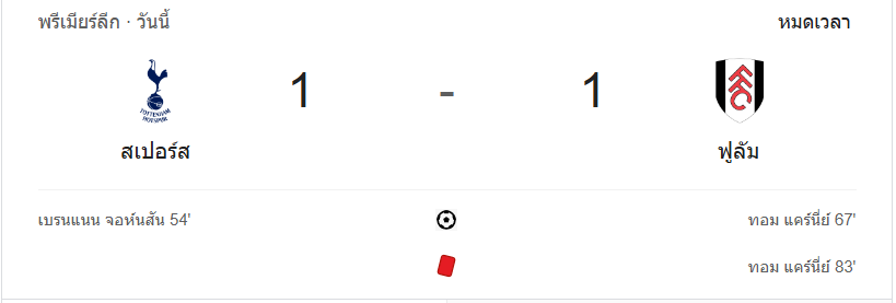 บ้านกีฬา พาคุณเจาะลึกผลบอลสดจากศึกพรีเมียร์ลีกค่ำคืนนี้ ท็อตแน่ม ฮ็อทสเปอร์เปิดบ้านเสมอฟูแล่ม 1-1 แม้ทั้งสองทีมพยายามเร่งเกมเพื่อคว้าชัย แต่สุดท้ายต้องจบด้วยการแบ่งแต้มในเกมที่เต็มไปด้วยความเข้มข้น ทั้งสองทีมมีโอกาสทำประตูสำคัญ ซึ่งทำให้แฟนบอลได้ลุ้นกันจนวินาทีสุดท้าย