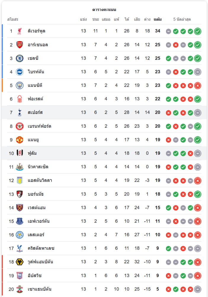 สเปอร์สยังคงอยู่ในอันดับที่ 7 ด้วยคะแนน 20 แต้ม ส่วนฟูแล่มเก็บแต้มเพิ่ม ขึ้นมาอยู่ที่อันดับ 10 มี 19 แต้ม