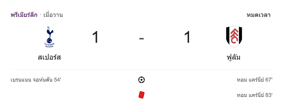 ในศึก พรีเมียร์ลีก 2024 ที่สนามท็อตแน่ม ฮ็อทสเปอร์ สเตเดี้ยม เจ้าบ้าน ท็อตแน่ม ฮ็อทสเปอร์ ทำได้เพียงเสมอกับ ฟูแล่ม 1-1 ในเกมที่เต็มไปด้วยความเข้มข้นตั้งแต่เริ่มจนจบ พร้อมไฮไลต์ของเกมที่ ทอม แคร์นี่ย์ กัปตันฟูแล่มโดนใบแดงหลัง VAR ตัดสินให้ลงโทษหนักในช่วงท้ายเกม