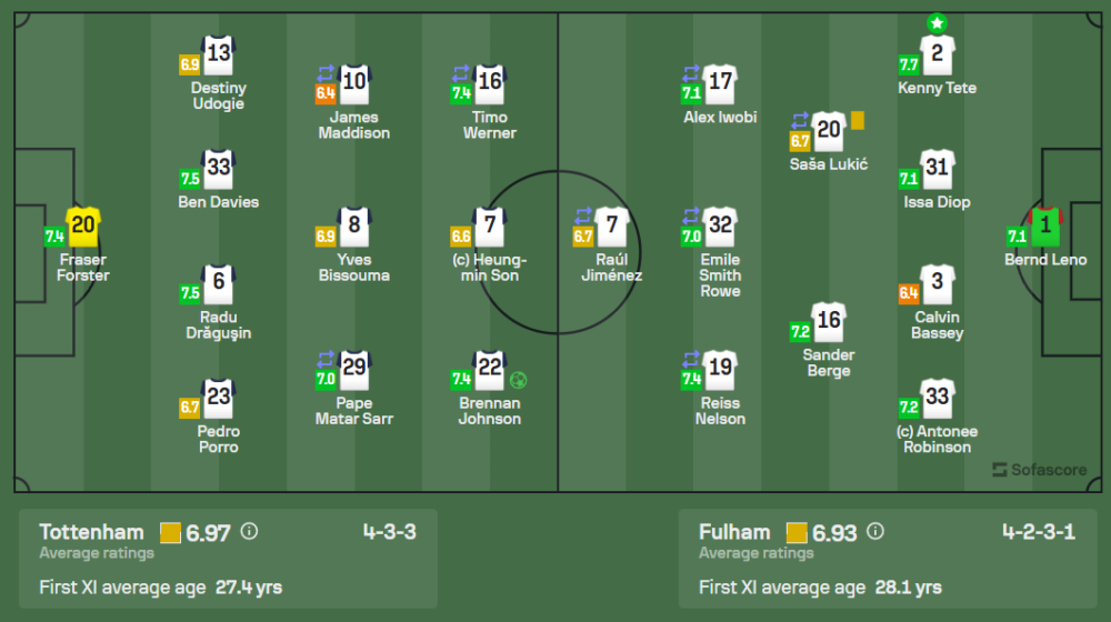 สเปอร์สได้เฮก่อนในนาทีที่ 54 จากลูกยิงของ เบรนแนน จอห์นสัน ที่ได้รับแอสซิสต์จาก ติโม แวร์เนอร์ แต่ฟูแล่มไม่ยอมแพ้ ตีเสมอในนาทีที่ 67 จากการจ่ายของ อเล็กซ์ อิโวบี้ และยิงโดย ทอม แคร์นี่ย์ อย่างยอดเยี่ยม อย่างไรก็ตาม ในนาทีที่ 83 แคร์นี่ย์โดน VAR ตัดสินให้โดนใบแดงออกจากสนาม จบเกมด้วยผลเสมอ 1-1