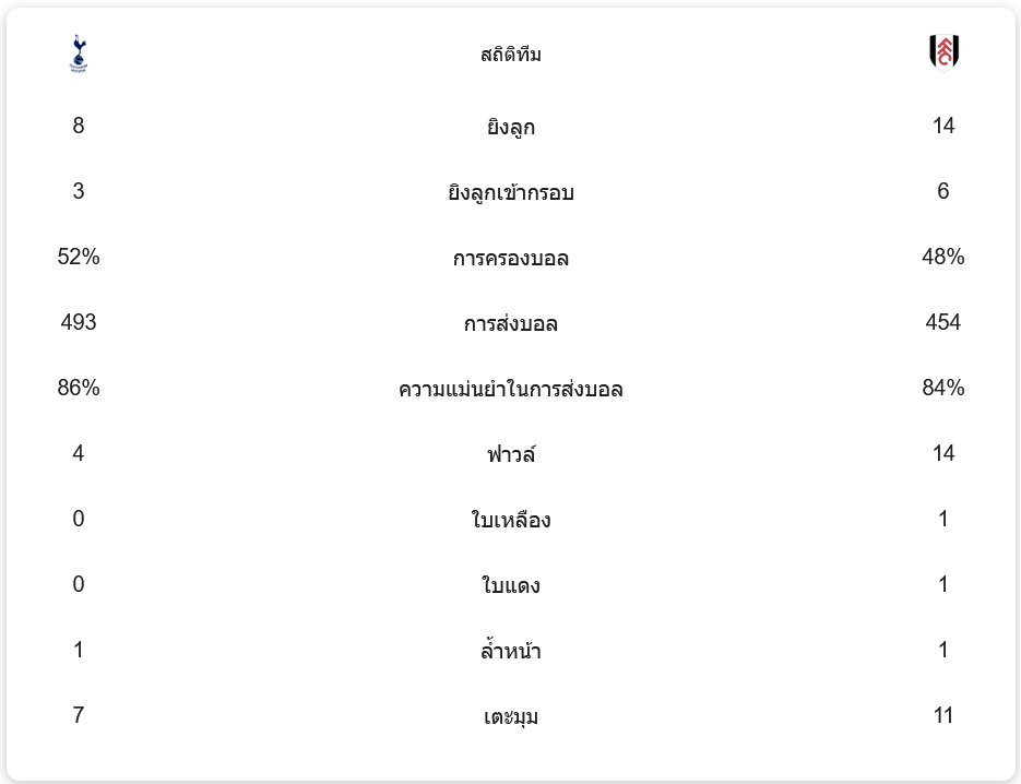 สเปอร์สครองบอลมากกว่าเล็กน้อยที่ 52% มีโอกาสยิง 8 ครั้ง ตรงกรอบ 3 ครั้ง ขณะที่ฟูแล่มยิง 14 ครั้ง ตรงกรอบ 6 ครั้ง ความแม่นยำในการผ่านบอลของทั้งสองทีมค่อนข้างสูสีกัน