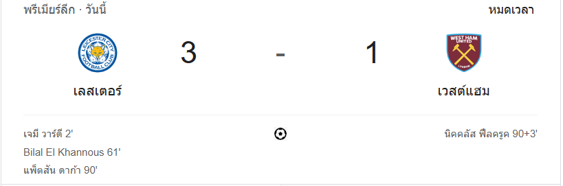นาทีที่ 90+5: จบเกม เลสเตอร์ ซิตี้เอาชนะเวสต์แฮม ยูไนเต็ดไปด้วยสกอร์ 3-1