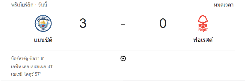 บ้านกีฬา รายงานผลบอลสดจากสนามเอติฮัด สเตเดี้ยม แมนเชสเตอร์ ซิตี้ โชว์ฟอร์มแกร่งเปิดบ้านถล่ม น็อตติ้งแฮม ฟอเรสต์ 3-0 จากผลงานยอดเยี่ยมของแบร์นาร์โด ซิลวา, เควิน เดอ บรอยน์ และเจเรมี โดกู ที่ช่วยกันยิงประตูพาทีมเก็บสามแต้มสำคัญ