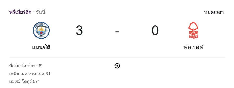 ผลบอลสด ศึกพรีเมียร์ลีกนัดสำคัญ แมนเชสเตอร์ ซิตี้ เปิดบ้านโชว์ฟอร์มร้อนแรง เอาชนะ น็อตติ้งแฮม ฟอเรสต์ 3-0 คว้า 3 แต้มสำคัญไล่จี้จ่าฝูงอย่างเข้มข้น การแข่งขันที่เต็มไปด้วยพลังและการครองบอลที่เหนือชั้นจากเจ้าบ้าน
