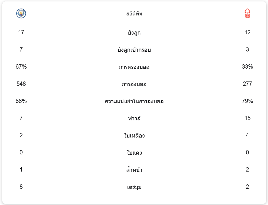 แมนเชสเตอร์ ซิตี้ครองบอลถึง 67% ยิงทั้งหมด 17 ครั้ง เข้ากรอบ 7 ครั้ง ขณะที่ฟอเรสต์มีโอกาสยิง 12 ครั้ง เข้ากรอบเพียง 3 ครั้ง การส่งบอลของซิตี้มีความแม่นยำถึง 88% เทียบกับฟอเรสต์ที่มีเพียง 79%