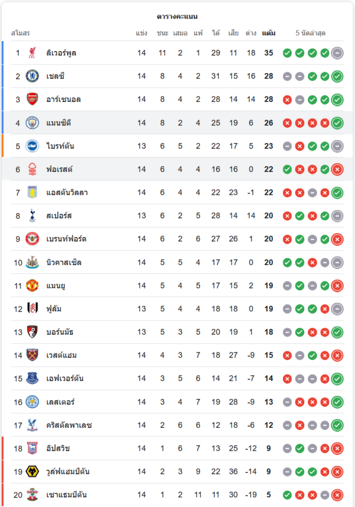 แมนเชสเตอร์ ซิตี้ ขึ้นมาอยู่ในอันดับ 4 ของตาราง มี 26 คะแนนจาก 14 นัด ไล่ตามจ่าฝูงอย่างลิเวอร์พูลเพียง 9 คะแนน ขณะที่น็อตติ้งแฮม ฟอเรสต์ ยังอยู่ในอันดับ 6 มี 22 คะแนน