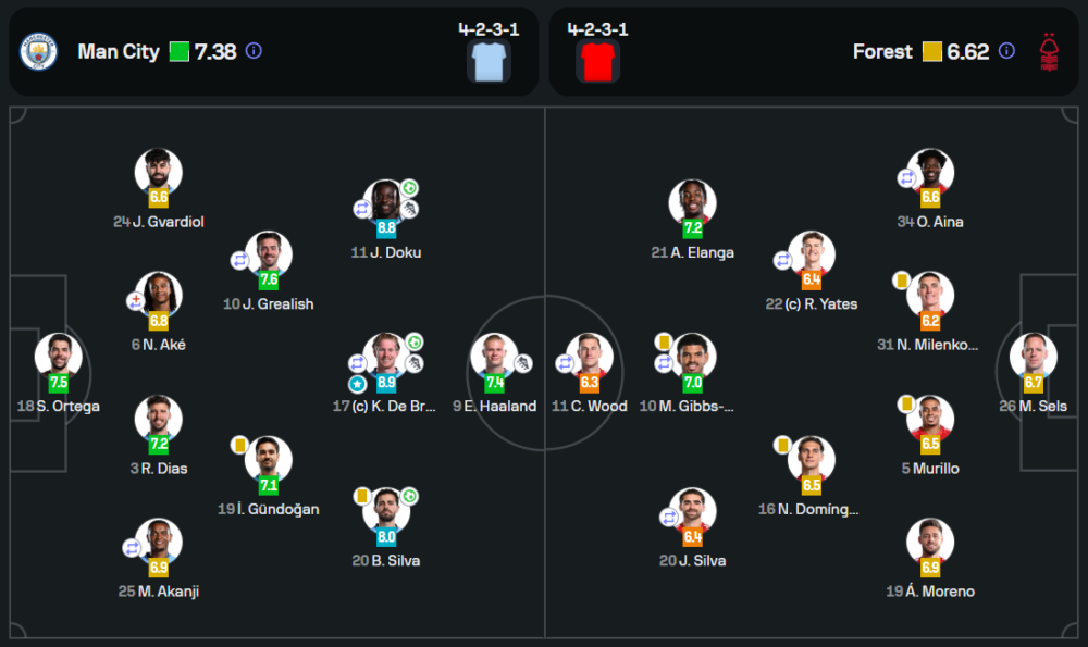 แมนเชสเตอร์ ซิตี้ ใช้แผน 4-2-3-1 เน้นการครองบอลและการโจมตีจากแดนกลาง ผ่านการสร้างสรรค์เกมของ เควิน เดอ บรอยน์ ขณะที่ฟอเรสต์มาในแผนเดียวกัน แต่เกมรับถูกบีบจนเสียพื้นที่และขาดความแม่นยำในการส่งบอล วิเคราะห์บอลชี้ให้เห็นถึงความต่างในประสิทธิภาพการเล่น โดยซิตี้เหนือกว่าในทุกด้าน ทั้งการจบสกอร์และการครองบอล