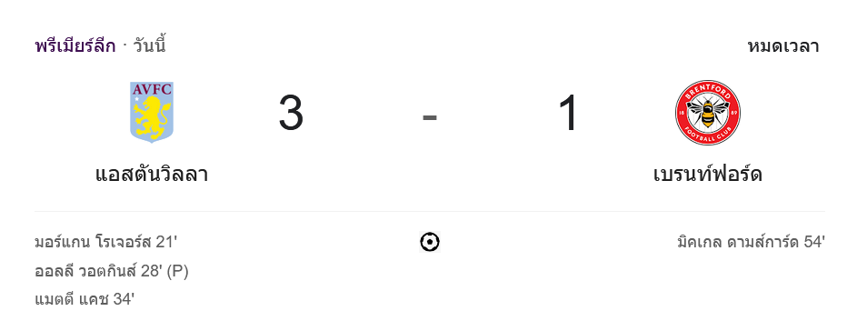 - ⚽ นาทีที่ 21: มอร์แกน โรเจอร์ส ยิงให้วิลล่านำ 1-0