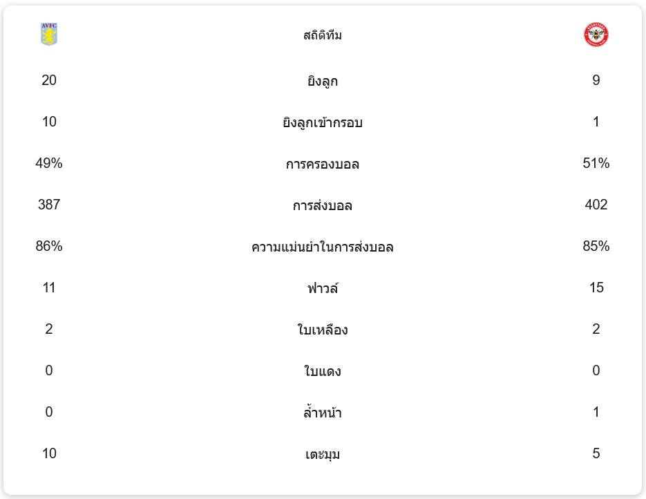 เกมนี้วิลล่ามีโอกาสยิง 20 ครั้ง เข้ากรอบ 10 ครั้ง ขณะที่เบรนท์ฟอร์ดมีโอกาสเพียง 9 ครั้งและยิงเข้ากรอบแค่ 1 ครั้ง การครองบอลค่อนข้างสูสี วิลล่าครองบอล 49% ส่วนเบรนท์ฟอร์ดครองบอล 51% แต่ทีมเจ้าบ้านกลับมีประสิทธิภาพในการจบสกอร์มากกว่าอย่างชัดเจน