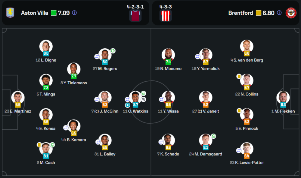 วิเคราะห์บอล เกมนี้ แอสตัน วิลล่า มาในระบบ 4-2-3-1 ที่เน้นเกมรุกและสร้างโอกาสจากพื้นที่ริมเส้น โดยมีโอลลี่ วัตกินส์ เป็นตัวจบสกอร์หลัก ซึ่งเขาสามารถดึงแนวรับเบรนท์ฟอร์ดให้หลุดตำแหน่งหลายครั้ง ขณะที่เบรนท์ฟอร์ดเล่นในระบบ 4-3-3 แต่กลับไม่สามารถครองบอลได้อย่างต่อเนื่องในแดนกลาง ส่งผลให้เสียบอลและโดนสวนกลับบ่อยครั้ง