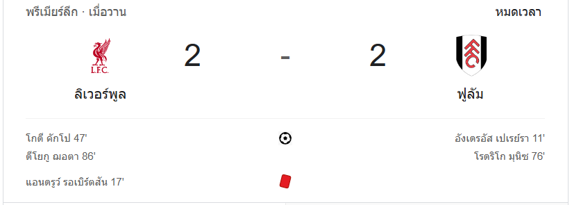 แม้ลิเวอร์พูลจะเสียเปรียบเรื่องผู้เล่นตั้งแต่ครึ่งแรก แต่ทีมสามารถกลับมาตีเสมอได้ในช่วงท้ายเกม ความมุ่งมั่นและการเปลี่ยนแผนที่เฉียบคมของทีมแสดงให้เห็นถึงศักยภาพของทีมระดับหัวตาราง ในขณะที่ฟูแล่มเองก็โชว์ฟอร์มได้อย่างน่าประทับใจ ทั้งสองทีมแบ่งแต้มกันไปในแมตช์ที่เต็มไปด้วยความดราม่าและจังหวะสุดเร้าใจ