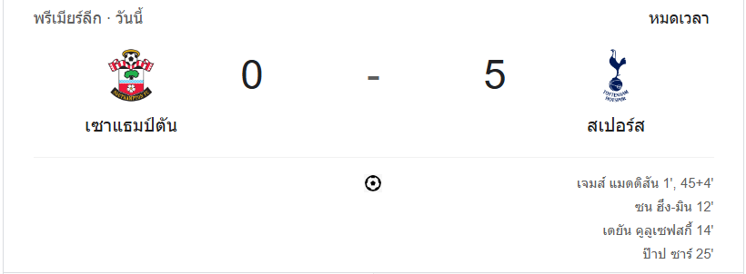 เกมนี้ ท็อตแน่ม ฮ็อทสเปอร์ แสดงให้เห็นถึงฟอร์มที่ร้อนแรงและเกมบุกที่เฉียบคม ไล่ยิงถล่ม เซาแธมป์ตัน แบบไม่ไว้หน้า โดยเฉพาะ เจมส์ แมดดิสัน ที่เหมาคนเดียว 2 ประตู ช่วยให้ทีมไก่เดือยทองเก็บสามแต้มสำคัญกลับบ้านได้อย่างสวยงาม ขณะที่เจ้าบ้าน เซาแธมป์ตัน ต้องเร่งปรับแผนและหาจังหวะคืนฟอร์มให้ได้ในเกมถัดไป