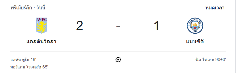 ผลบอลสด พรีเมียร์ลีก 2024 ระหว่าง แอสตัน วิลล่า 2-1 แมนเชสเตอร์ ซิตี้ วันนี้ 21/12/67