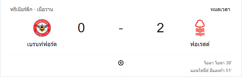 เกมนี้จบลงด้วยสกอร์ 2-0 ทำให้น็อตติ้งแฮม ฟอเรสต์เก็บสามแต้มสำคัญ ขณะที่เบรนท์ฟอร์ดยังคงต้องปรับปรุงเกมรุกเพื่อเพิ่มโอกาสทำประตูในนัดต่อไป