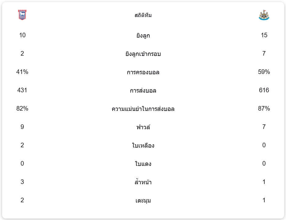 นิวคาสเซิ่ล ครองบอลได้ถึง 59% และจ่ายบอลสำเร็จถึง 616 ครั้งด้วยความแม่นยำ 87% เมื่อเทียบกับอิปสวิชที่ครองบอลได้เพียง 41% และจ่ายบอลสำเร็จ 431 ครั้ง แสดงให้เห็นถึงการครองเกมและการจบสกอร์ที่เฉียบคมของนิวคาสเซิ่ล