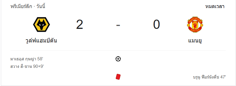 ชัยชนะครั้งสำคัญของ วูล์ฟแฮมป์ตัน ที่เปิดบ้านเชือด แมนเชสเตอร์ ยูไนเต็ด ไป 2-0 โดยได้ประโยชน์จากการเหลือ 10 คนของทีมเยือนในครึ่งหลัง ก่อนที่จะมาได้ประตูชัยจาก มาเธอุส คุนญ่า และ ฮวาง ฮี-ชาน ในช่วงท้ายเกม