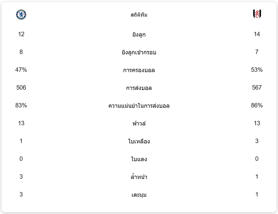เชลซีมีโอกาสยิงทั้งหมด 12 ครั้ง เข้ากรอบ 8 ครั้ง ขณะที่ฟูแล่มมีโอกาสยิง 14 ครั้ง เข้ากรอบ 7 ครั้ง ฟูแล่มครองบอล 53% และมีการส่งบอลสำเร็จถึง 567 ครั้ง เทียบกับเชลซีที่ส่งบอลสำเร็จ 506 ครั้ง