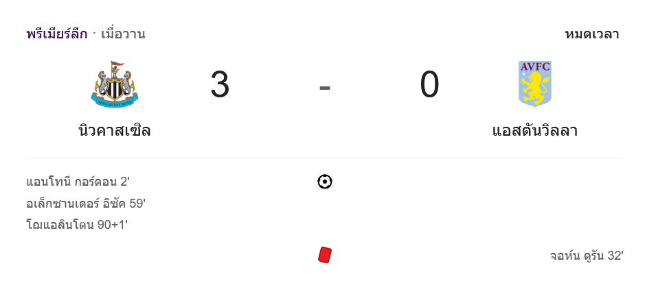 จาก : ผลบอลสด พรีเมียร์ลีก 2024 ระหว่าง นิวคาสเซิ่ล ยูไนเต็ด 3-0 แอสตัน วิลล่า วันนี้ 26/12/67 – บ้านกีฬา