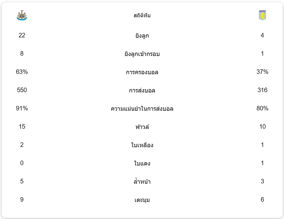 นิวคาสเซิ่ล ยิง 22 ครั้ง ตรงกรอบ 8 ครั้ง ครองบอล 63% ส่งบอล 550 ครั้ง ความแม่นยำ 91% ขณะที่ แอสตัน วิลล่า ยิงเพียง 4 ครั้ง ตรงกรอบ 1 ครั้ง ครองบอล 37% ส่งบอล 316 ครั้ง ความแม่นยำ 80%