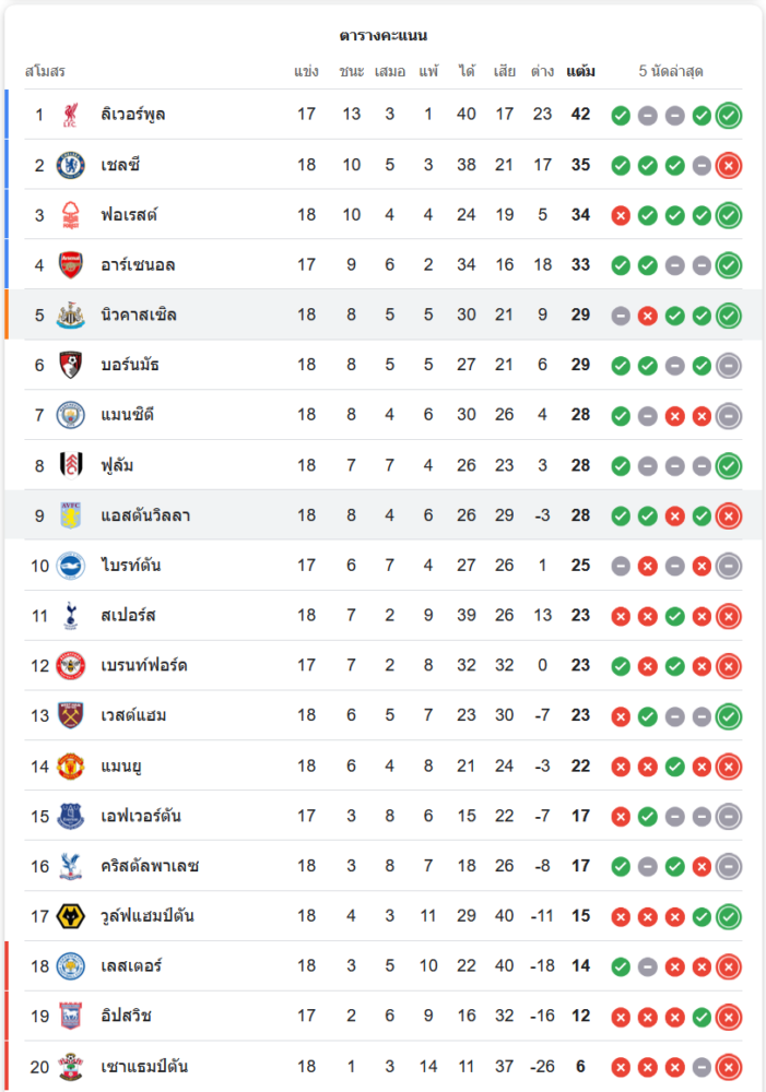 นิวคาสเซิ่ล ขยับขึ้นอันดับ 5 มี 29 คะแนน จาก 18 นัด ส่วน แอสตัน วิลล่า หล่นไปอยู่อันดับ 9 มี 28 คะแนน
