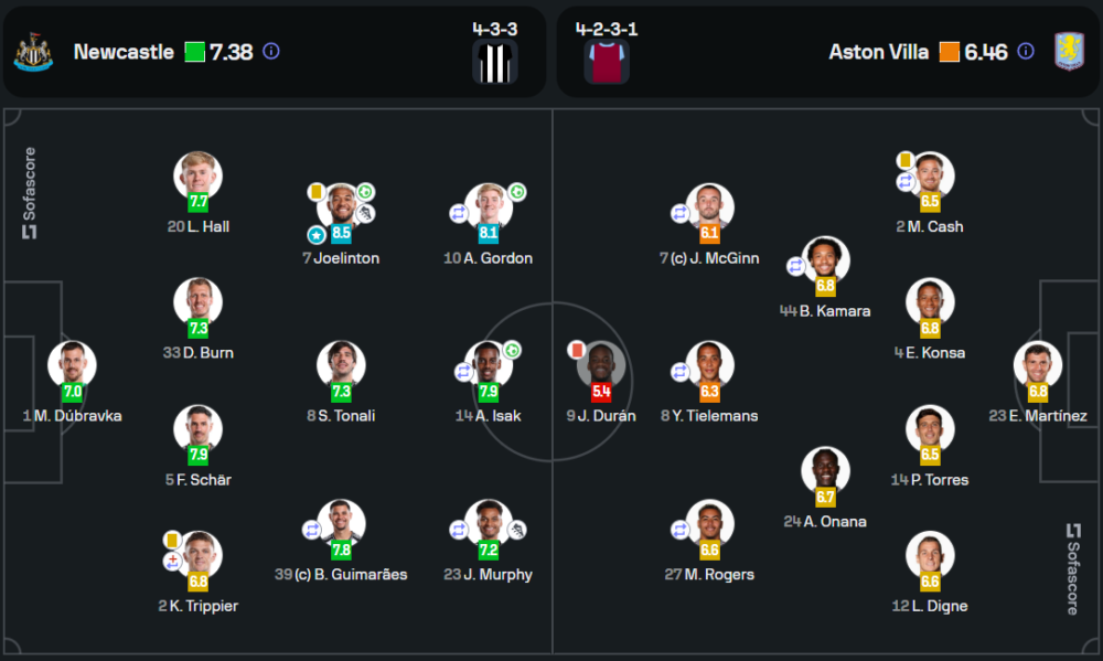 นิวคาสเซิ่ล ออกตัวได้อย่างร้อนแรง เปิดเกมรุกตั้งแต่นาทีที่ 2 เมื่อ แอนโทนี่ กอร์ดอน ซัดประตูขึ้นนำ 1-0 จากการแอสซิสต์ของ โจลินตัน ต่อมา แอสตัน วิลล่า พยายามตอบโต้แต่ก็ต้องเสียเปรียบเมื่อ โจนาธาน ดูราน โดนใบแดงไล่ออกจากสนามในนาทีที่ 32 ทำให้ทีมเยือนเล่นเหลือ 10 คน นับจากนั้น นิวคาสเซิ่ล คุมเกมได้ทั้งหมด
