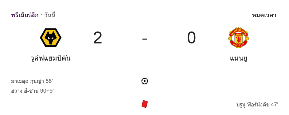 - ⚽ นาทีที่ 58: มาธิอัส คุนญ่า ทำประตูขึ้นนำให้วูล์ฟแฮมป์ตัน