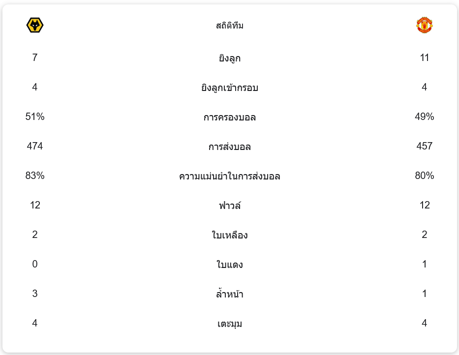 วูล์ฟแฮมป์ตันครองบอลได้ 51% ขณะที่แมนเชสเตอร์ ยูไนเต็ด ครองบอล 49% ทั้งสองทีมมีโอกาสยิงรวมกัน 18 ครั้ง โดยวูล์ฟแฮมป์ตันยิงเข้ากรอบถึง 4 ครั้ง และสามารถเปลี่ยนเป็น 2 ประตูสำคัญได้