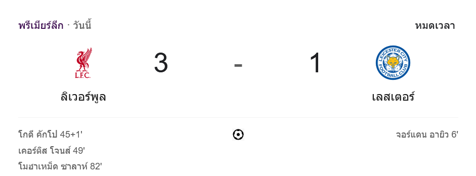 บ้านผลบอล สรุปผล ลิเวอร์พูลย้ำแค้นเลสเตอร์ 3-1 ครองจ่าฝูงพรีเมียร์ลีกต่อเนื่อง